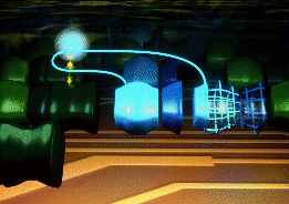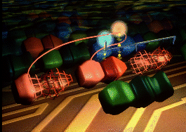 A Parasite (blue, two piece object) uses its CPU (blue sphere) to execute