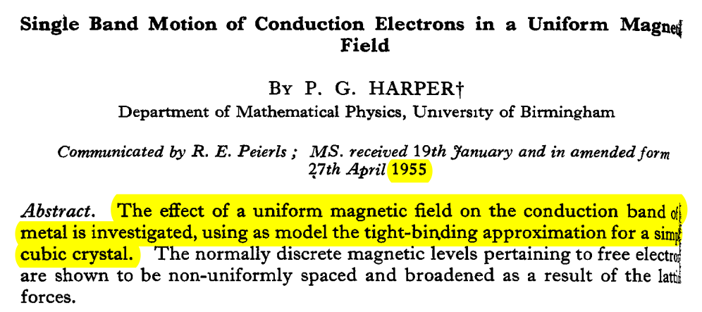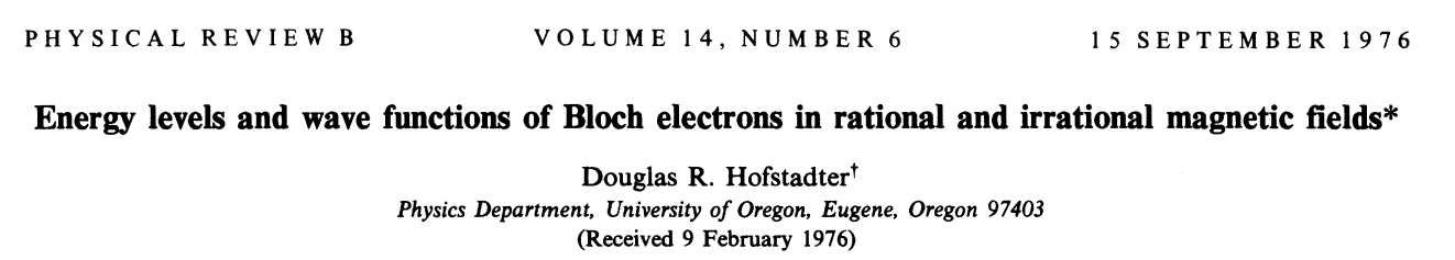 For a given \(\omega\) (Magnetic flux) and a phase \(\phi\) \[ (H^{}_{\omega,\phi} x)_n = x_{n+1}+x_{n-1} + 2\cos {2\pi (\omega n+\phi)} x_n, n \in \mathbb{Z}. \]