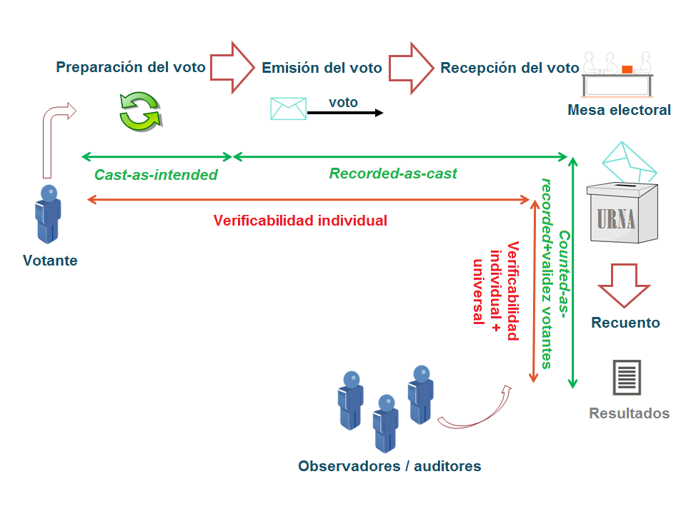 Hemos visto que hay dos problemáticas básicas: que el votante pueda asegurar que el voto que emite representa sus opciones, y que se pueda auditar el proceso de anonimización de los votos y recuento. De los requisitos de seguridad del voto electrónico podemos extraer otras, como poder verificar que sólo se cuenta un voto por votante, y que estos votos han sido emitidos por votantes válidos. Existen varias clasificaciones según el tipo de verificabilidad (ver figura 10):