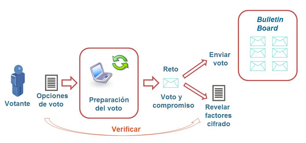 El proceso de verificación consiste en seguir los pasos de la aplicación de voto hasta que las opciones de voto elegidas son cifradas por el cliente de votación, y después tener la oportunidad de pedir al cliente que abra el voto cifrado para ver que lo que había dentro y se iba a enviar era efectivamente lo que se había elegido (ver figura 11). Este método fue propuesto en principio por Josh Benaloh [15] y se utiliza en el sistema de voto por Internet Helios [11, 12], un sistema que empezó como una prueba académica y que se ha utilizado en muchas elecciones universitarias y cada vez gana más atención. La idea es que una vez ha cifrado el voto, el cliente de votación se compromete mostrando al votante un hash del valor del voto cifrado. Con comprometerse, queremos decir que el cliente de votación da un dato referente al voto cifrado (en este caso, el valor de su hash) de forma que más tarde no puede retractarse y decir que el valor del voto cifrado era otro. Antes de enviar el voto, el votante tiene la oportunidad de auditarlo y pedir al cliente de voto que muestre los valores con los que ha cifrado el voto (por ejemplo, en caso del algoritmo de cifrado de ElGamal mostraría el valor aleatorio que ha usado para cifrar), para que el votante pueda comprobar que cifrando las opciones escogidas con los valores entregados por el cliente, el hash del resultado coincide con el compromiso dado. En caso de auditar el voto, éste se vuelve a cifrar con otros valores diferentes antes de ser enviado para que el votante no pueda usar los valores entregados por el método de verificación, para demostrar a un tercero cómo ha votado. El servidor de voto remoto dispone de una herramienta de publicación de los votos recibidos, normalmente conocida como bulletin board. Este bulletin board juega un papel muy importante en los protocolos de voto verificables. En [44] se explica que un bulletin board es un canal público donde los participantes autorizados pueden publicar datos, y, una vez publicados, no pueden ser ni borrados ni sobrescritos por nadie. Entonces, el votante puede comprobar que, en caso de decidir enviarlo, el voto cifrado al que el cliente de voto se había comprometido, antes de que el votante eligiera entre enviarlo o auditarlo, es el que ha recibido el servidor de voto. Como el cliente de voto se compromete al valor del voto cifrado antes de saber si el votante lo auditará o no, no puede comprometerse a un voto diferente al que enviará sin que haya un 50% de probabilidad de que el votante le descubra.