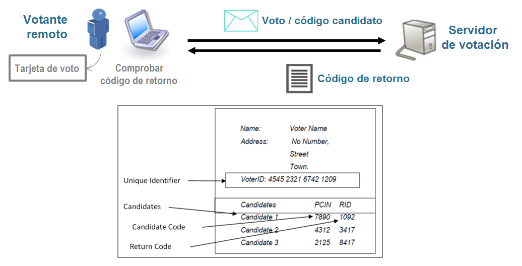 Son una de las funcionalidades de los protocolos Pollsterless de los que hablamos en la sección 2. La principal idea es que el servidor de voto remoto utiliza una clave secreta para generar nuevos valores a partir del voto cifrado que ha enviado el votante. Estos valores o códigos de retorno se envían al votante, que está en posesión de una tarjeta especial donde aparecen todas las opciones de voto posibles con los correspondientes códigos de retorno asignados (ver figura 12). Si los códigos recibidos se corresponden con los que en la tarjeta están asignados a las opciones escogidas, suponiendo que los códigos de retorno que hay en las tarjetas sólo son conocidos por los votantes, y que la clave del servidor de voto se mantiene secreta, el votante puede estar seguro de que las opciones cifradas recibidas en el servidor son las mismas que las que él ha escogido.