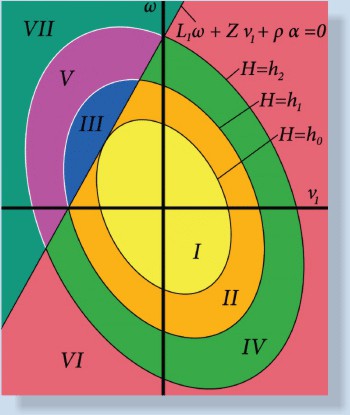 divide the phase plane in 7 zones with different behaviour (as depicted