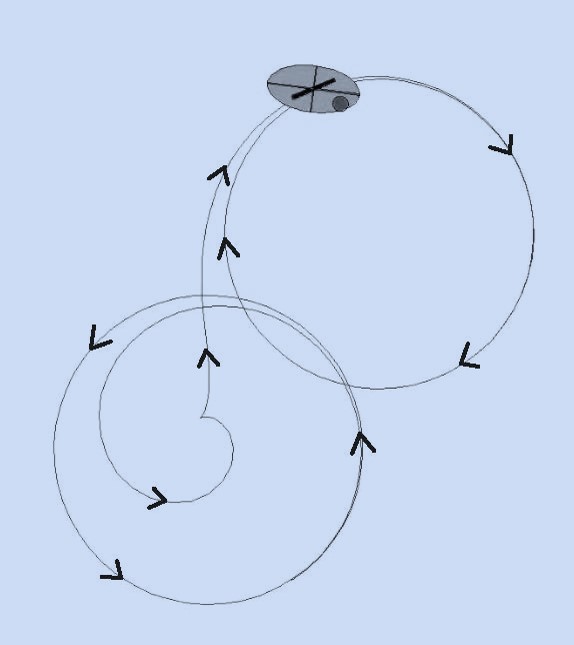 to periodic circular motion of the sleigh. The trajectories are arcs of